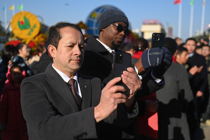 来自尼泊尔的客商(左)正在义乌国际商贸城旁不雅开市典礼的舞龙表演(2025年2月9日摄)。记者 黄治 摄。